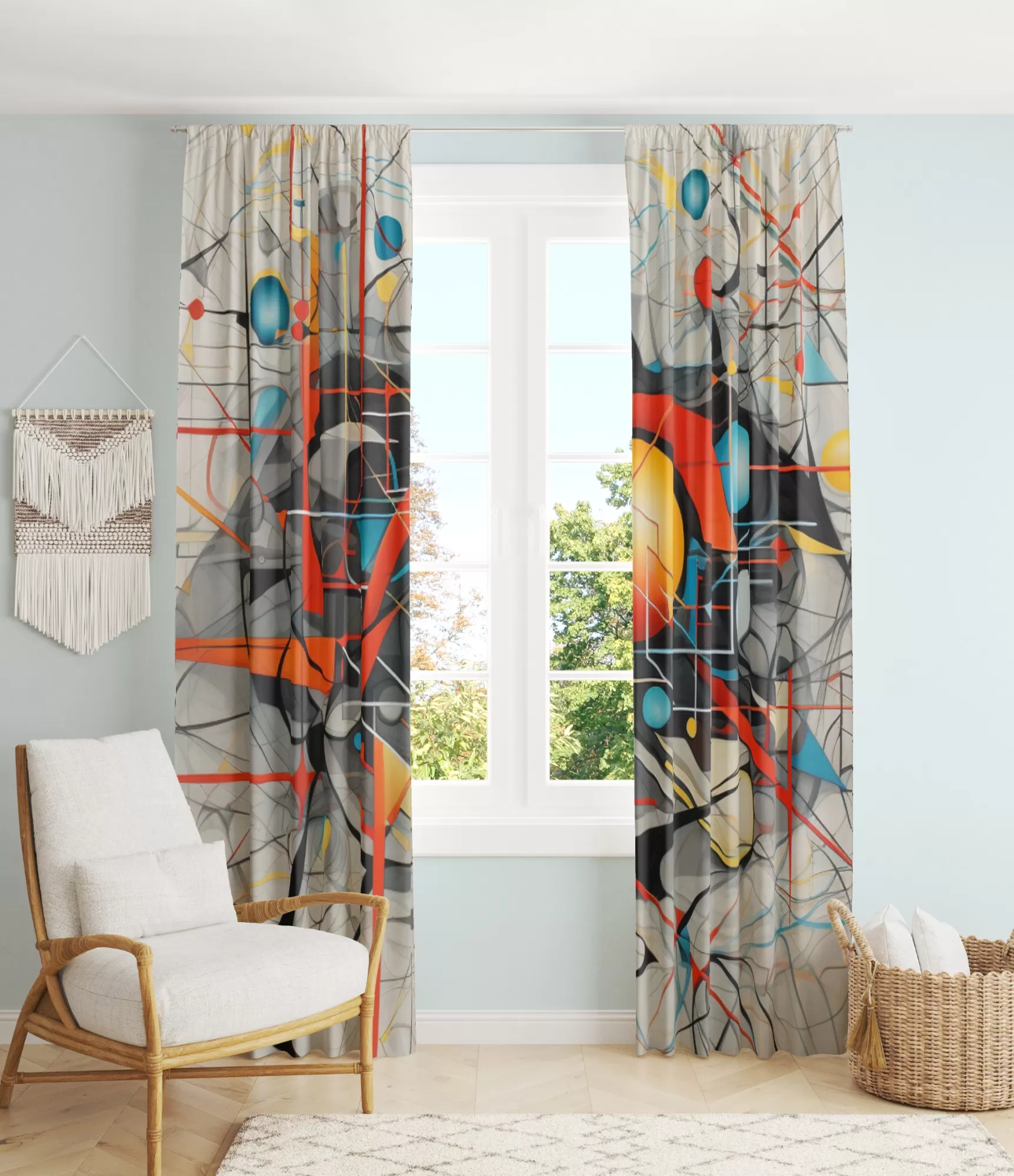 Денні штори сірого кольору з яскравими абстрактними геометричними деталями додадуть вашій кімнаті тонкий, але водночас виразний акцент. Ці штори не тільки надають елегантності, але й створюють динамічний візуальний ефект, що привертає увагу до деталей вашого інтер'єру.