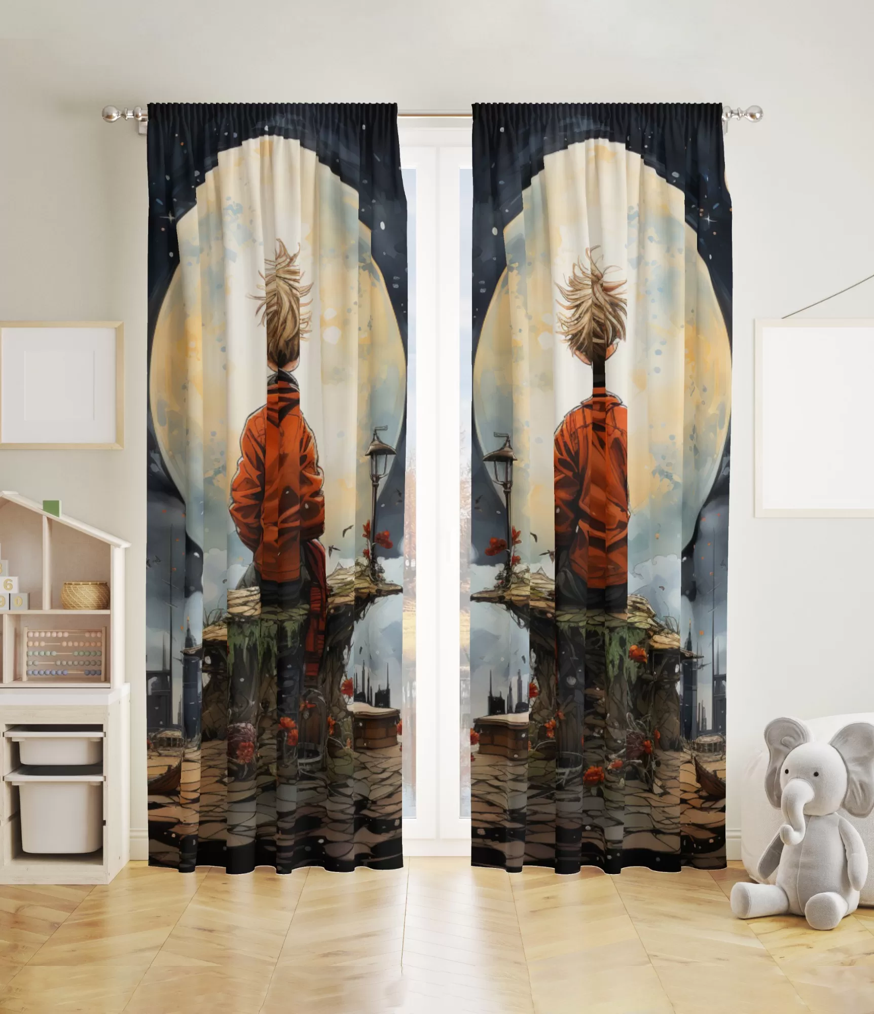 Штори для дитячої кімнати з мотивами казки "Маленький принц" створюють таємничу та філософську атмосферу, дозволяючи дитині досліджувати світ, наповнений чудесами. Дизайн надихає та розвиває уяву дитини, виховує чутливість до краси та важливості світу.