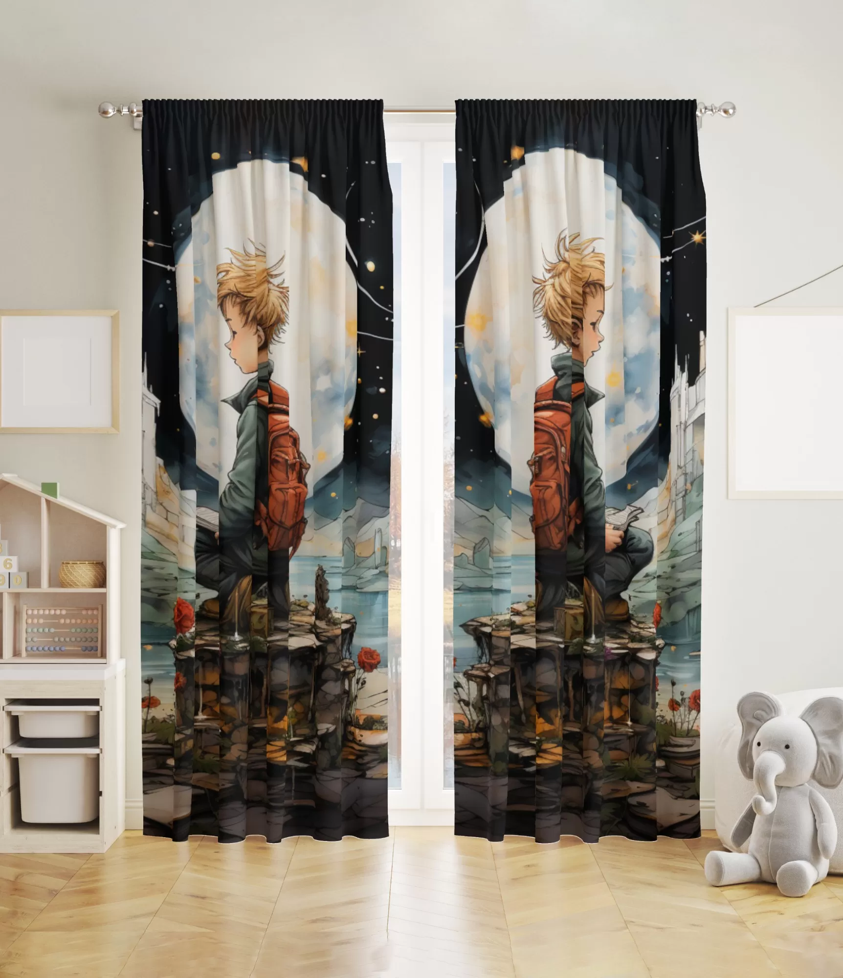 Штори для дитячої кімнати з мотивами казки "Маленький принц" створюють таємничу і філософську атмосферу, дозволяючи дитині досліджувати світ, наповнений чудесами. Дизайн надихає і розвиває уяву дитини, виховує чутливість до краси і важливості світу.