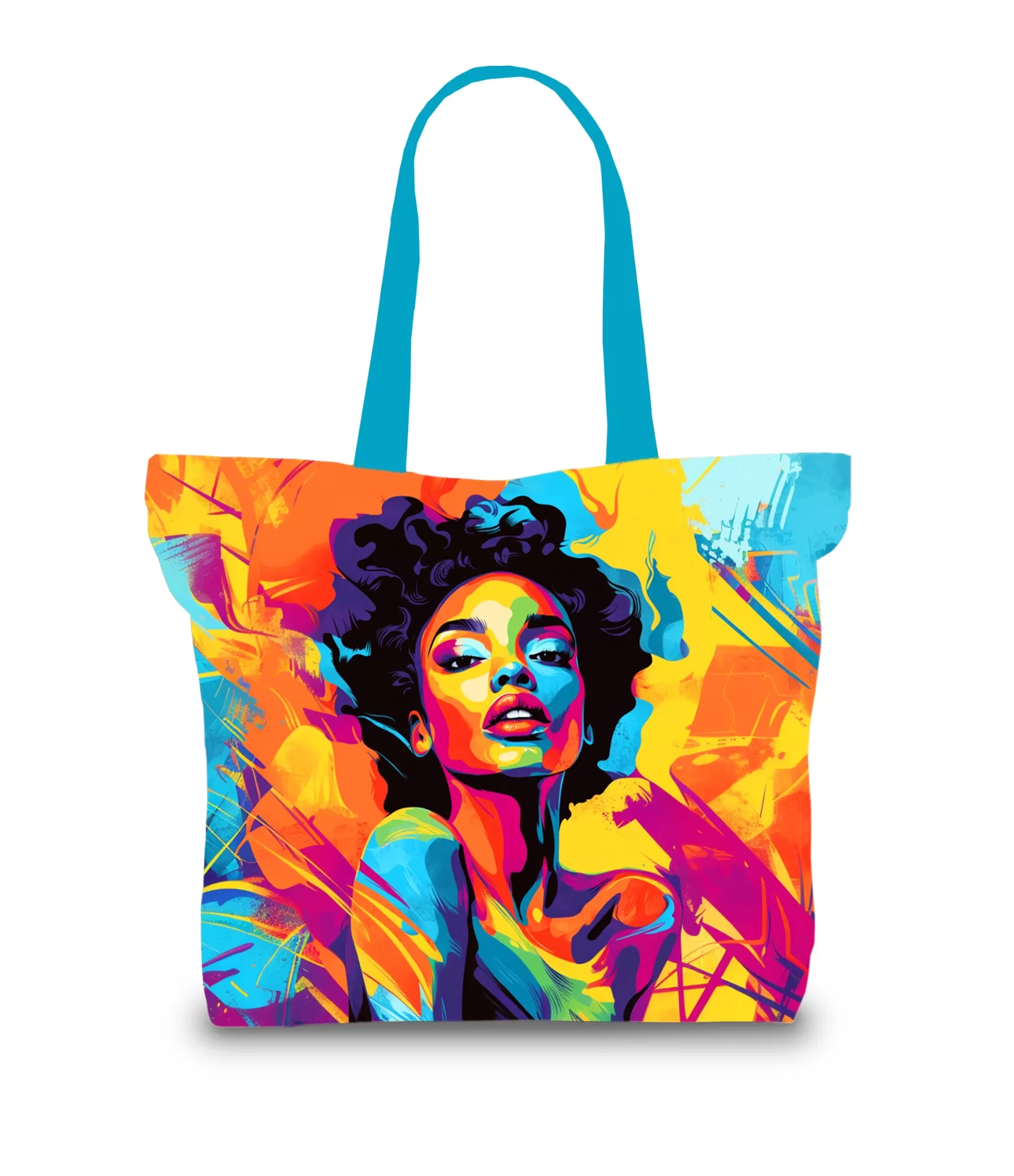 Ця жіноча сумка з яскравим абстрактним портретом – це поєднання мистецтва та практичності, яке чудово підійде для ваших щоденних потреб. Дизайн прикрашають динамічні відтінки оранжевого, жовтого, синього, пурпурного та рожевого кольорів, що створюють вражаючу гармонію мазків і графічних елементів. Яскраві кольори виділяються на нейтральному фоні, додаючи аксесуару унікальності та універсальності. Міцні бірюзові ручки забезпечують зручність носіння, а містка конструкція ідеально підходить як для покупок, так і для щоденного використання або подорожей.