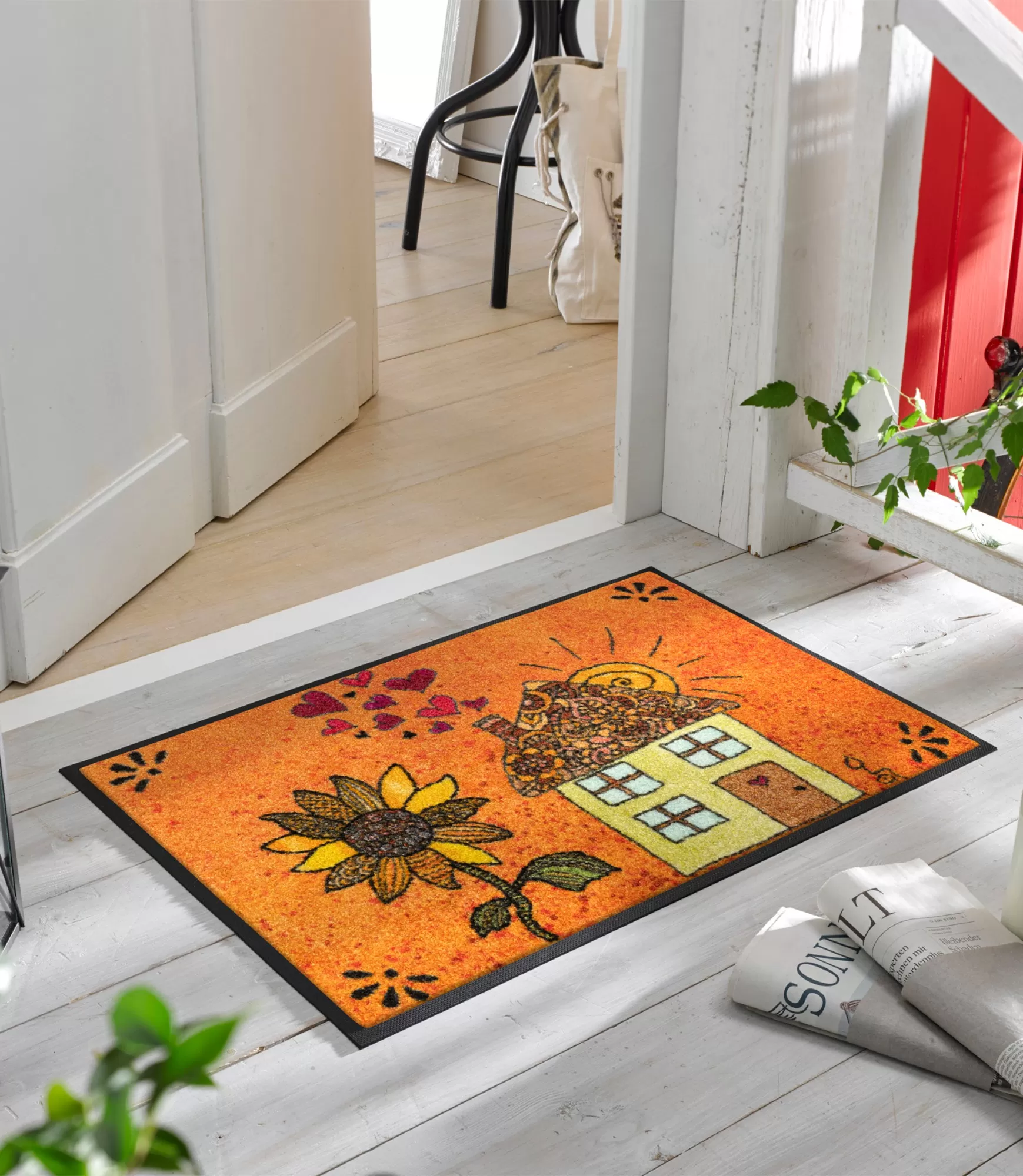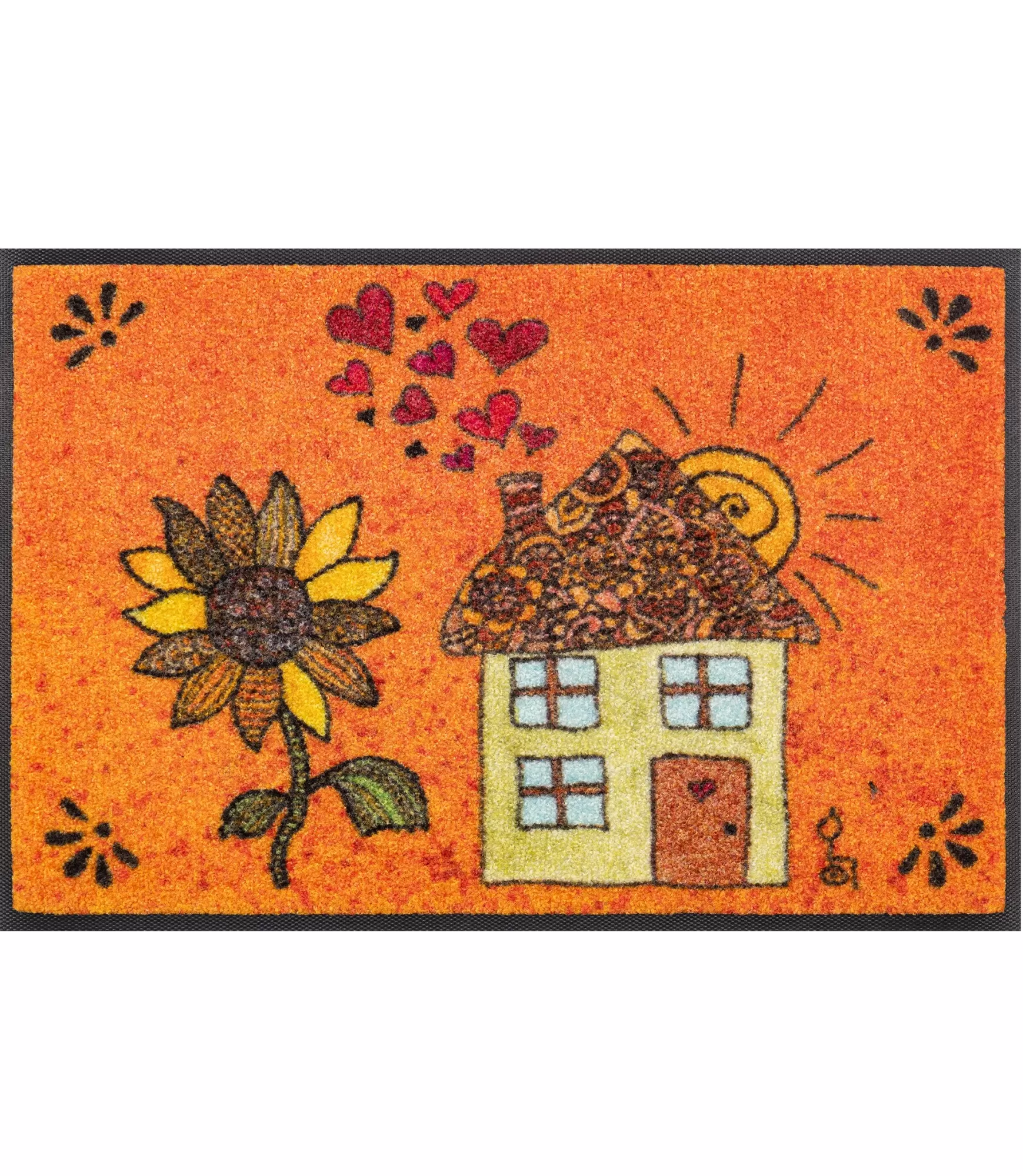 Килимок у яскравих та теплих тонах Сонячний будинок зображує будиночок та соняшник на помаранчевому фоні. Такий дизайн підійде для сучасних та мінімалістичних інтер'єрів, а також для заміських будинків.
