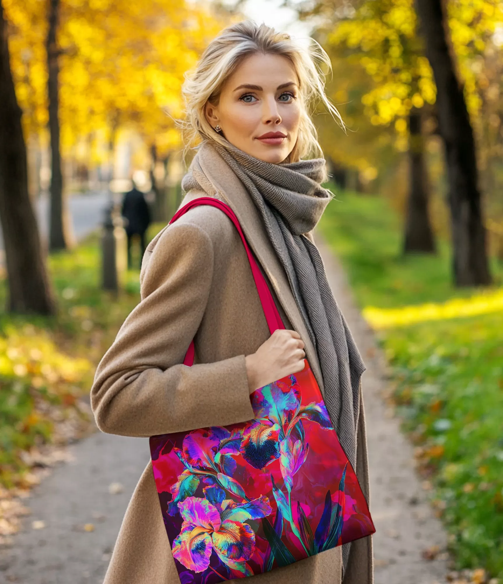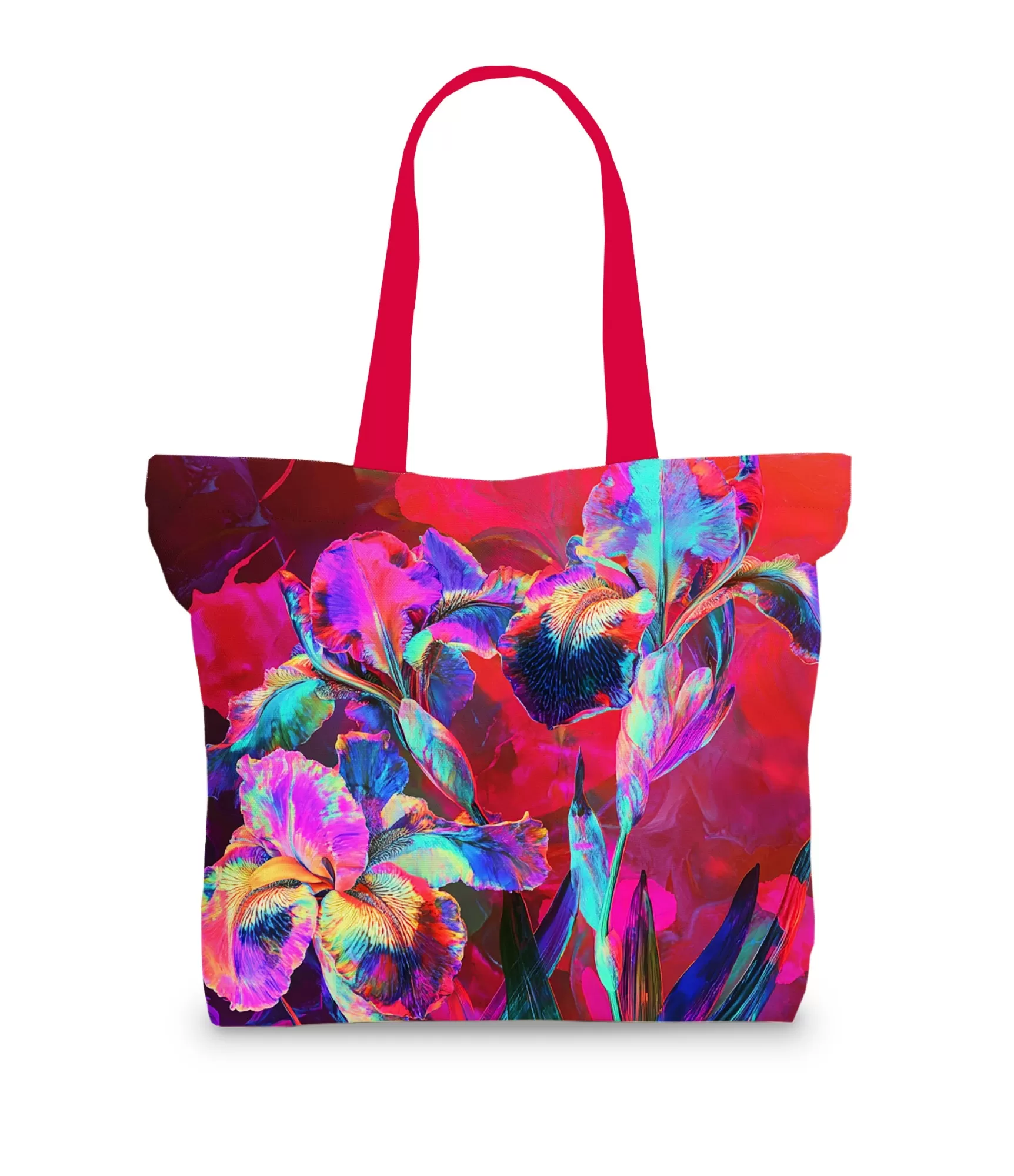 Іриси, що стали акцентом цієї сумки, мають інтенсивне поєднання синього, рожевого, жовтого та фіолетового кольорів. Їхню насиченість ще більше підкреслюють контрастні темні центри. Абстрактний фон, що складається з глибоких червоних та рожевих відтінків, ніжно доповнює яскраві квіти, дозволяючи їм виділятися та створювати вражаючий образ. Ручки яскраво-рожевого кольору завершують цей сміливий і елегантний дизайн.