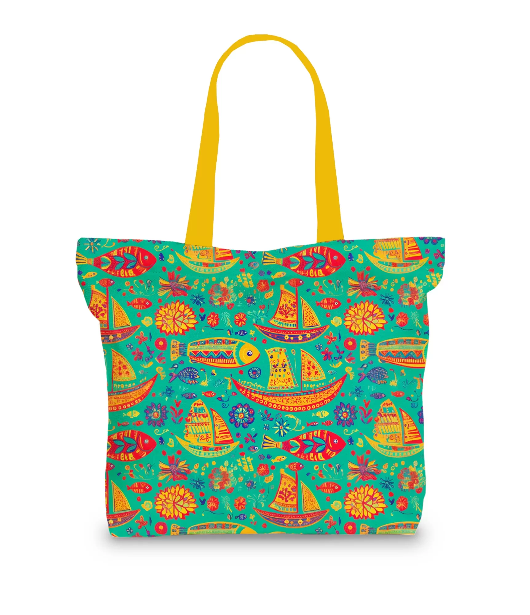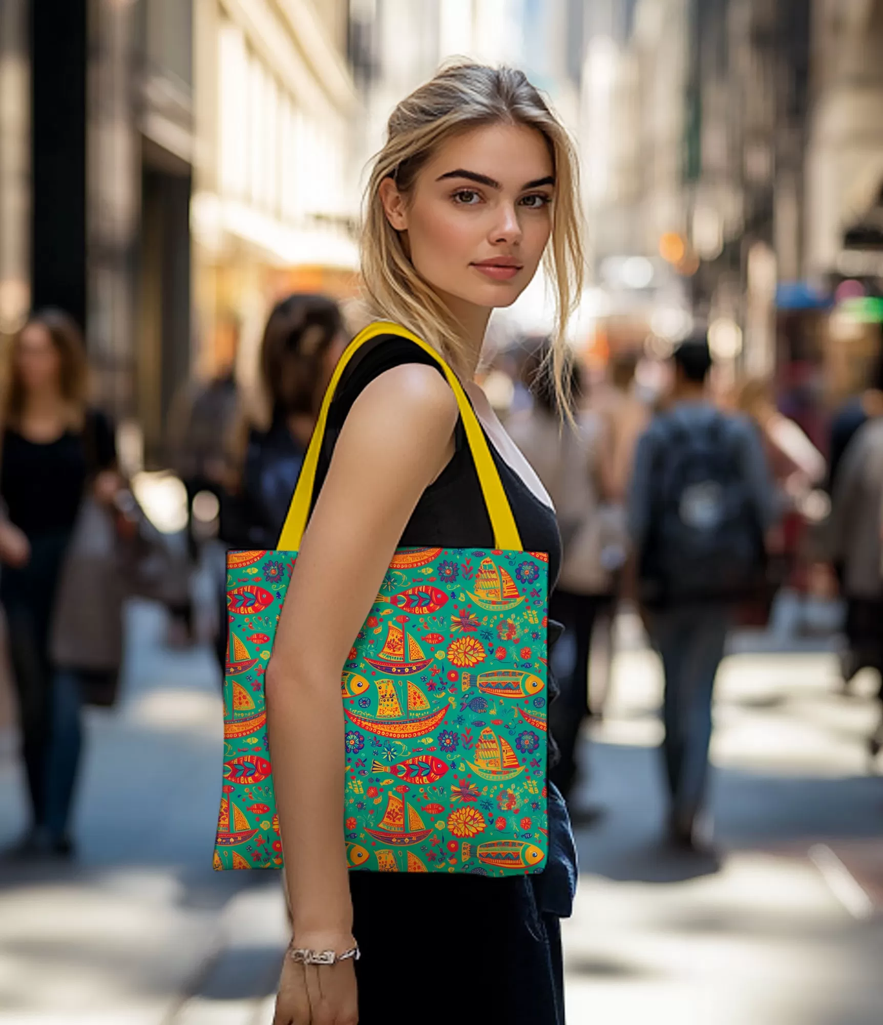 Ця жіноча сумка з яскравим, грайливим візерунком – чудовий вибір, щоб виокремити свій стиль і показати свою індивідуальність. Барвисті рибки, вітрила і квіти на бірюзовому фоні створюють енергійний і сонячний образ. Яскраве поєднання оранжевого, жовтого та червоного надає сумці грайливості та тепла. Міцні жовті ручки та місткий інтер'єр забезпечують зручність, тому вона стане ідеальним вибором як для щоденного використання, так і для поїздки на пляж чи покупки. Це чудовий подарунок для мами, сестри чи подруги – аксесуар, який відразу стане улюбленим і стильним акцентом!