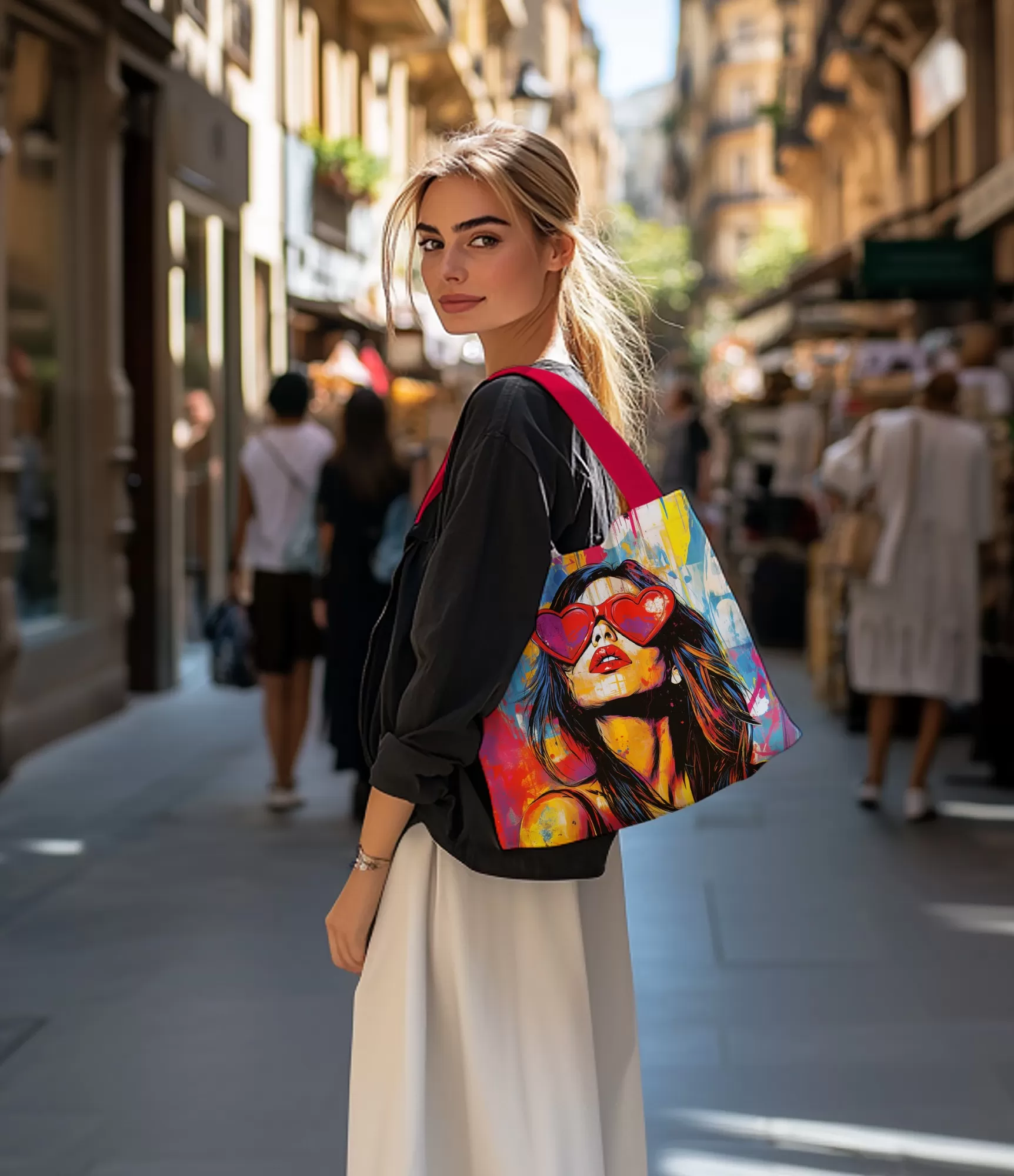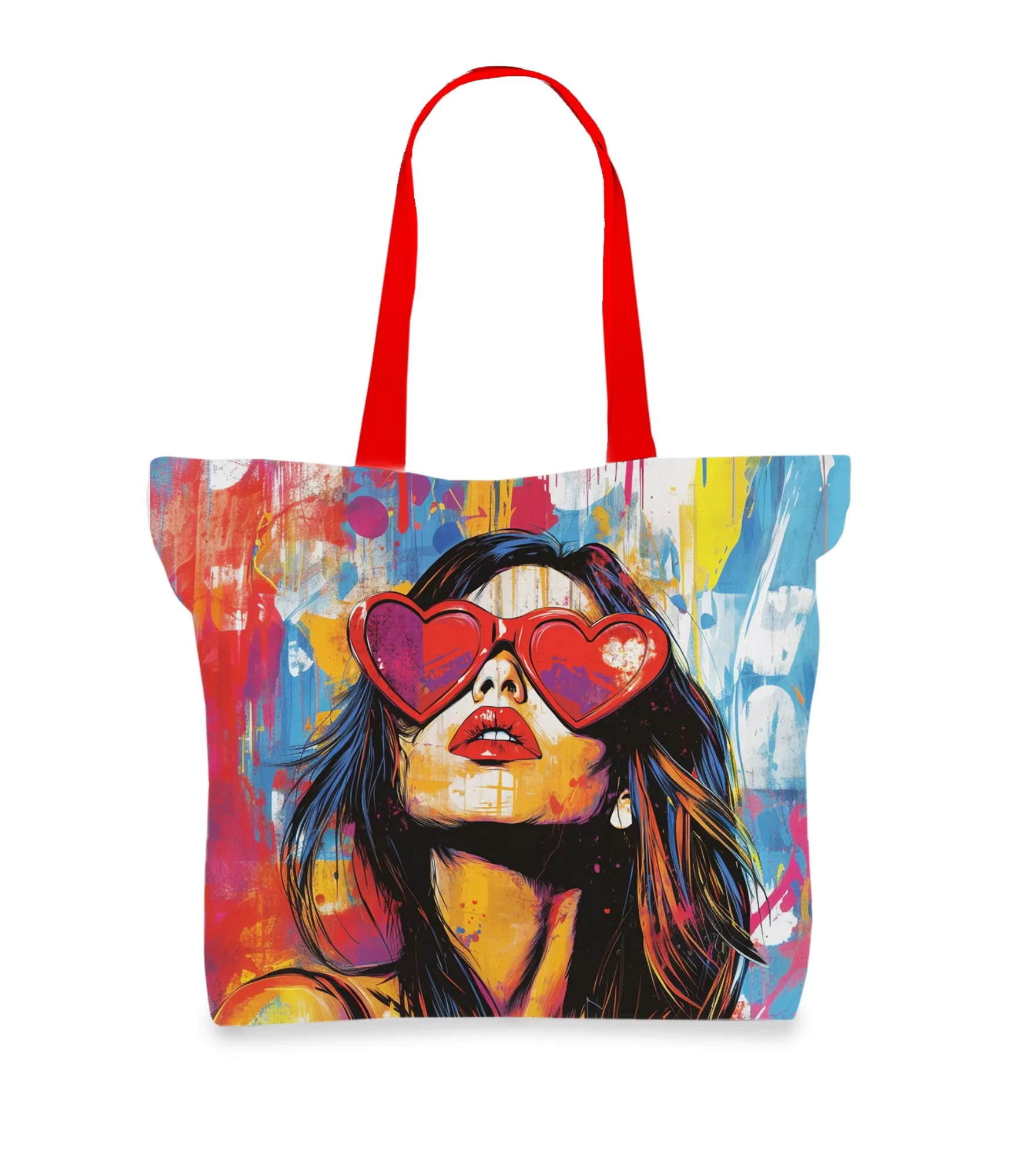 В центрі сумки – яскравий образ жіночого обличчя, натхненний естетикою попарту та вуличного мистецтва. Вона носить великі сонцезахисні окуляри у формі серця, а її вираз – впевнений у собі та трохи спокусливий. Поєднання кольорів яскраве та привертає увагу. Домінуючі кольори: червоний, рожевий, жовтий, блакитний та оранжевий, створюючи ефект високого контрасту. Сонцезахисні окуляри у формі серця мають яскраво-червоний колір, підкреслюючи основні риси. На фоні можна побачити фарбові плями та сплески кольору в стилі графіті, що додають дизайну динамічності та енергії.