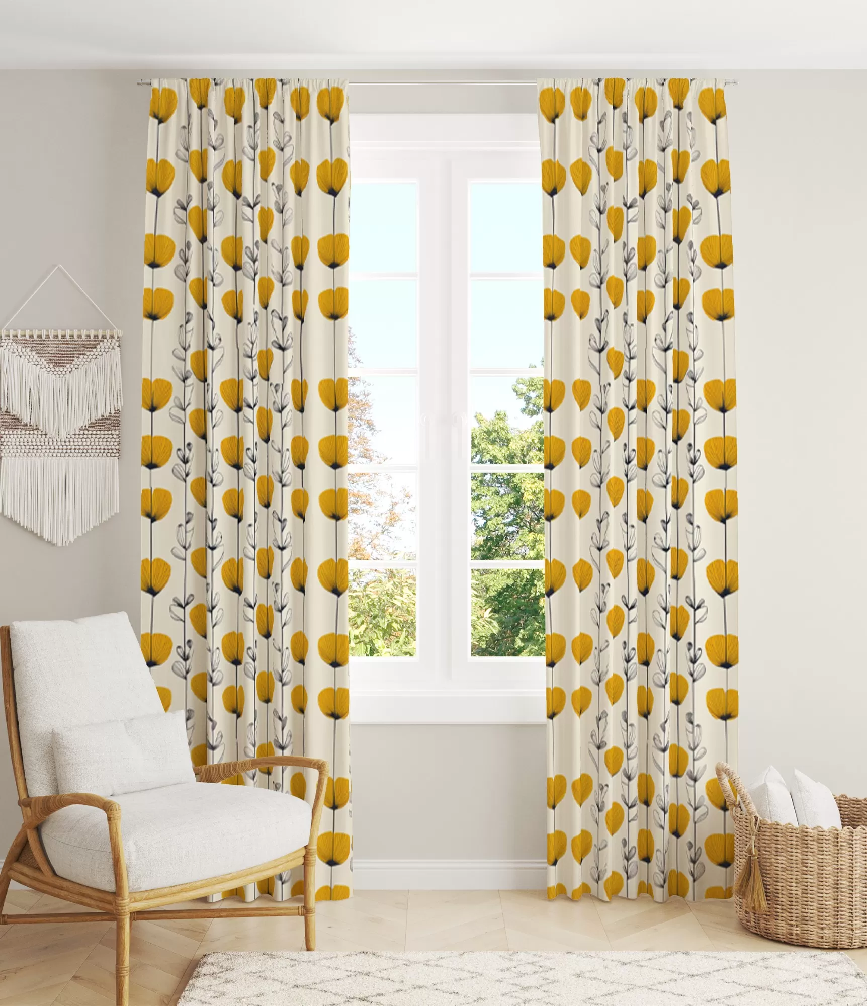 Нічні штори з білим фоном надають кімнаті відчуття чистоти і простору. Дрібні рослинні мотиви, делікатно розміщені на них, надають природності та елегантності. Візерунки рослин м'яко проступають на білому тлі, надаючи інтер'єру свіжість і спокій. Такі штори поєднуються з різними стилями, від мінімалізму до класичних рішень, зберігаючи тонкий баланс між простотою та красою. Рослинні мотиви нагадують нам про близькість природи, створюючи м'який і заспокійливий візуальний ефект.
