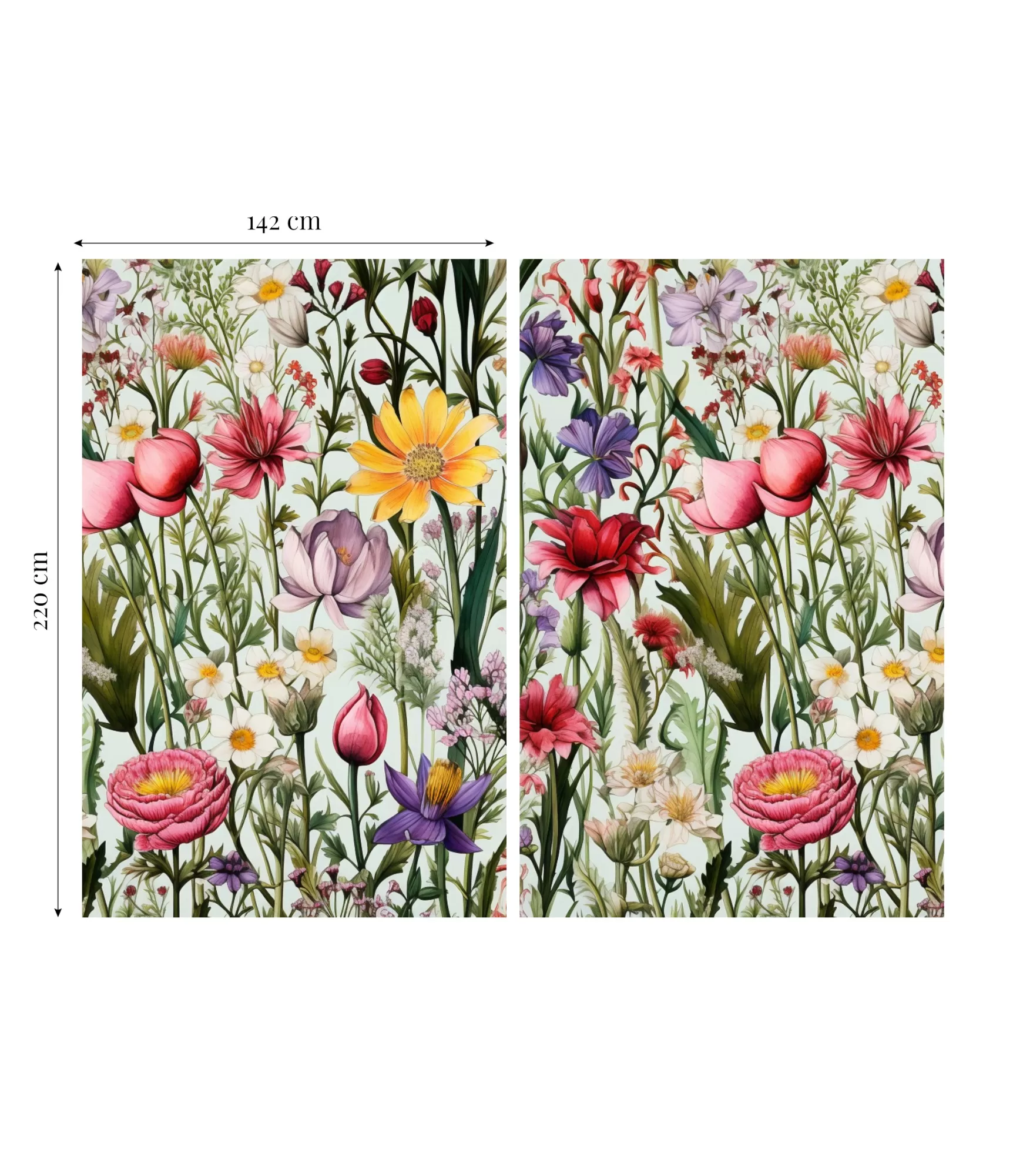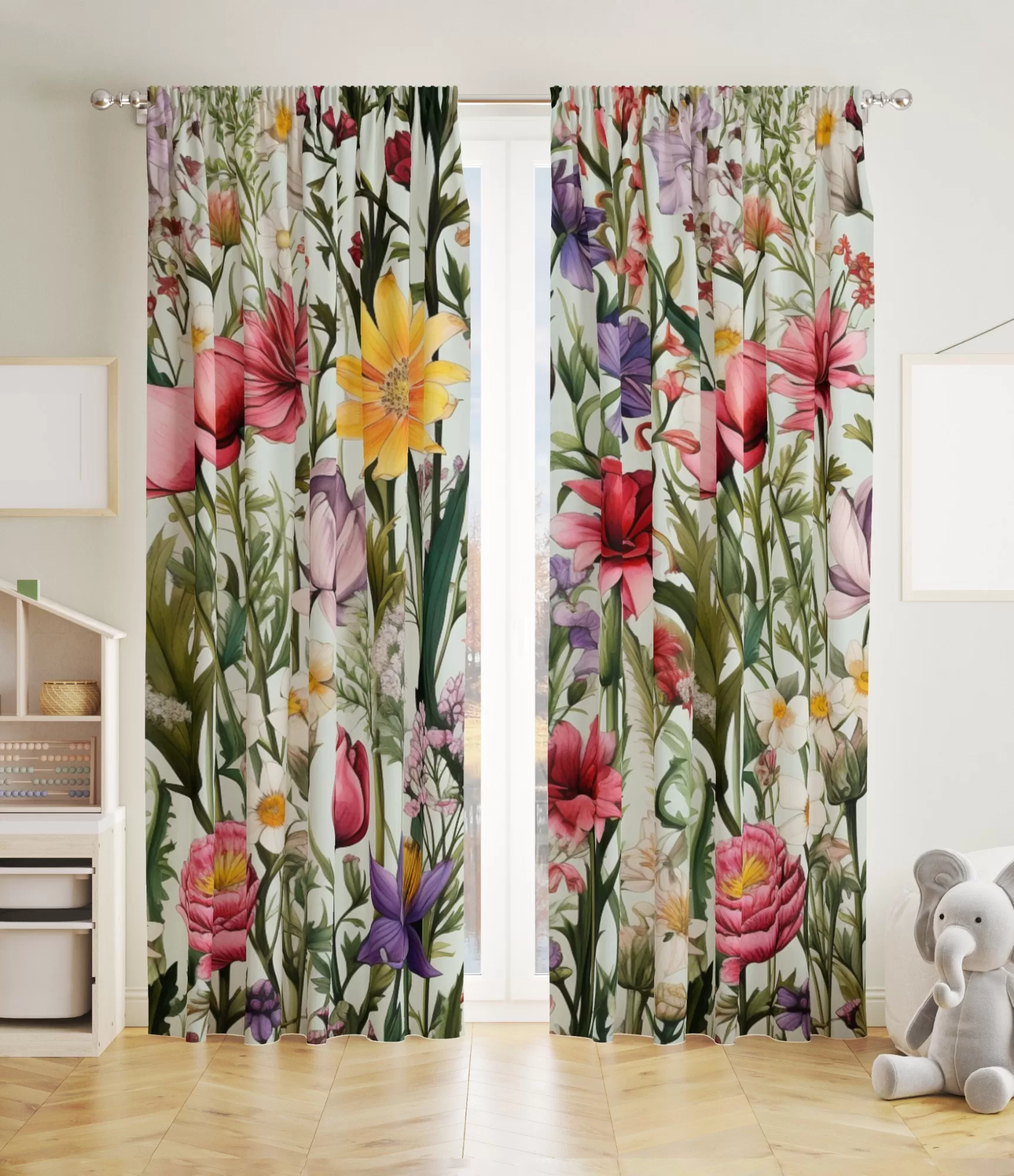 Світлий фон з різноманітними літніми квітами, такими як ромашки, маки та конвалії, що додають свіжості та яскравості кімнаті. Ці штори створюють яскраву та радісну атмосферу в будинку. Крім того, вони є практичним вибором, оскільки їх легко прати в пральній машині.