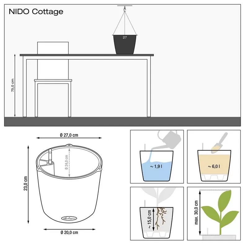 Набір Nido Cottage All-in-One включає: Зовнішній горщик, Внутрішній горщик із системою поливу, Кабелі з нержавіючої сталі для підвішування