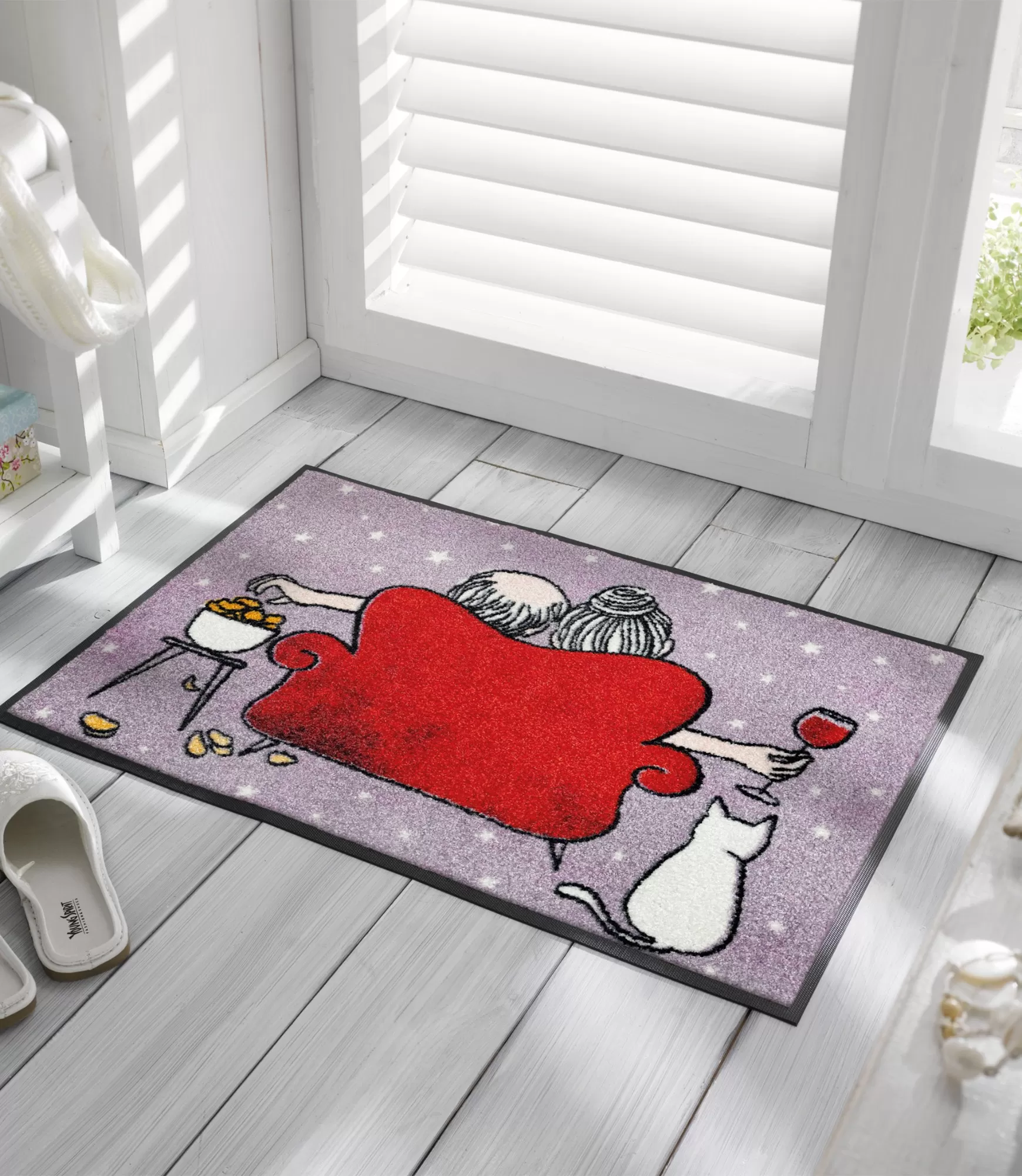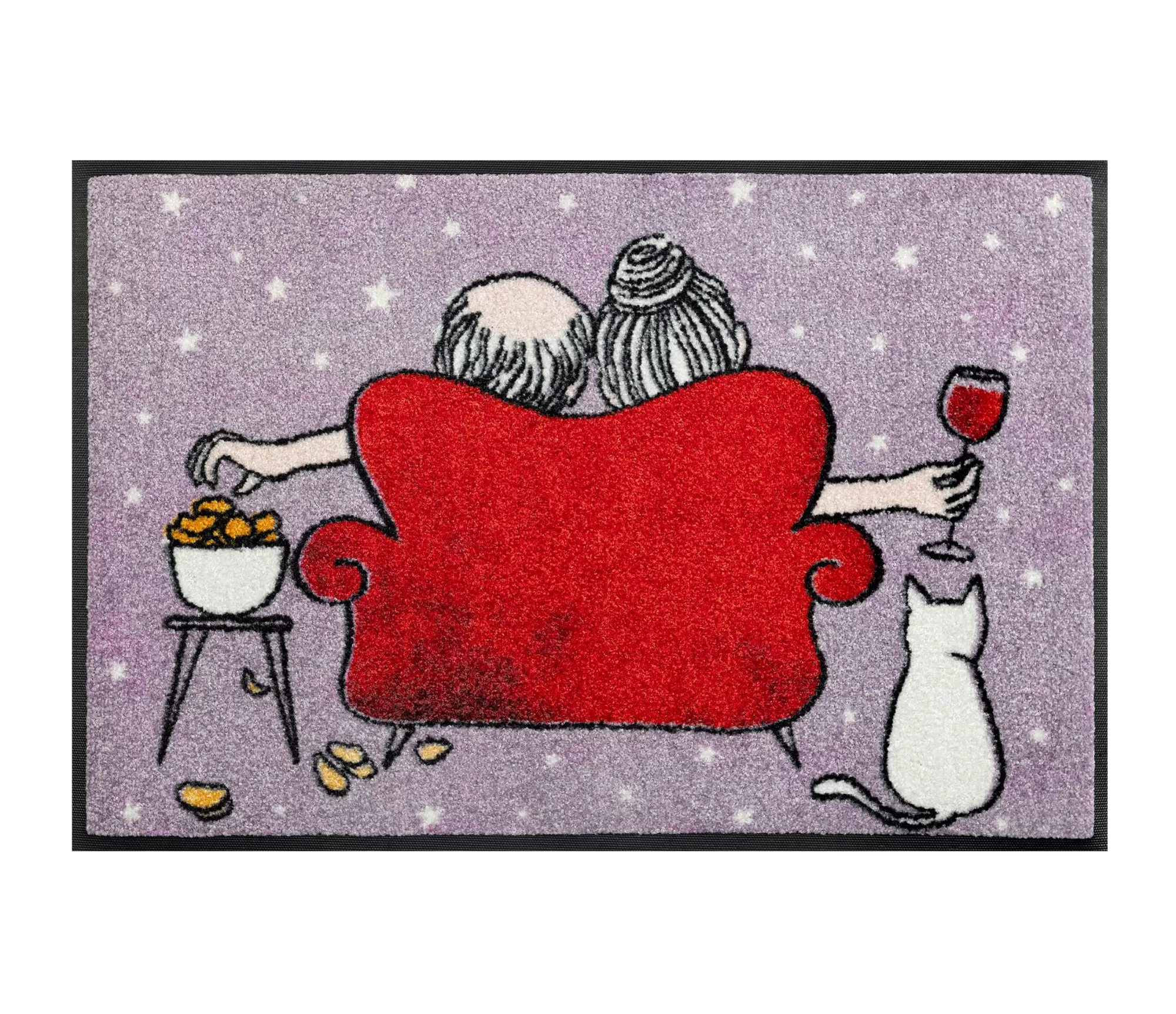 Кольорові брудозахисні килими - це чудова ідея подарунку для того, хто цінує чистоту й охайність вдома. Це стильний аксесуар, що прикрасить будь-яку оселю. Стилізований візерунок килимка Good Times зображує пару, що відпочиває на дивані з келихом вина в руці та чіпсами. Поруч з ними сидить білий кіт. Хоча всі персонажі зображені зі спини, цей малюнок створює відчуття легкості, спокою та гармонії.