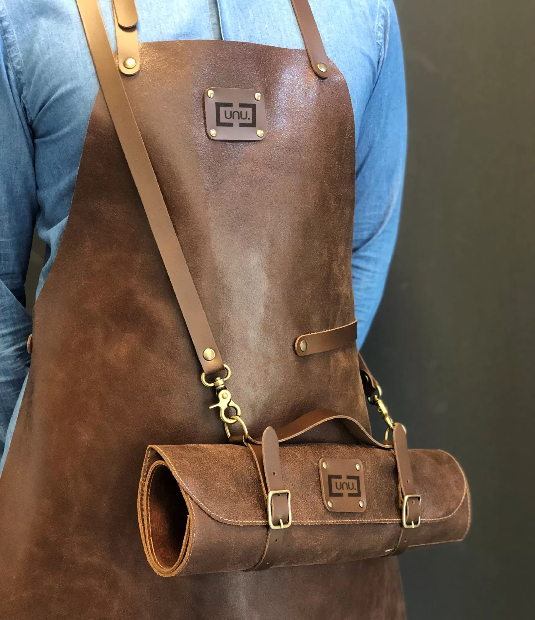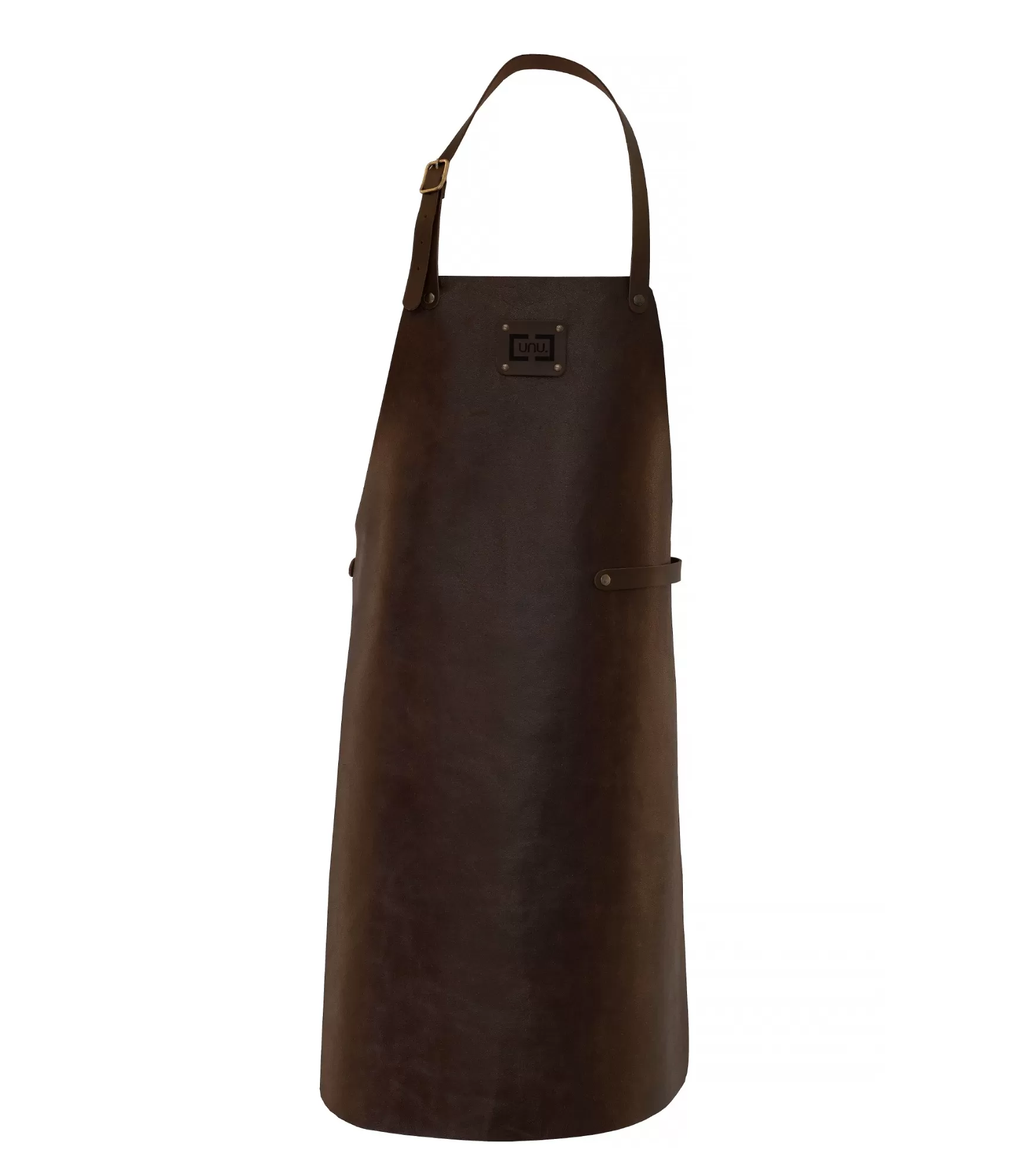 Шкіряний фартух для барбекю виготовлений з якісної шкіри з тисненням логотипу UNU і регульованими лямками.
