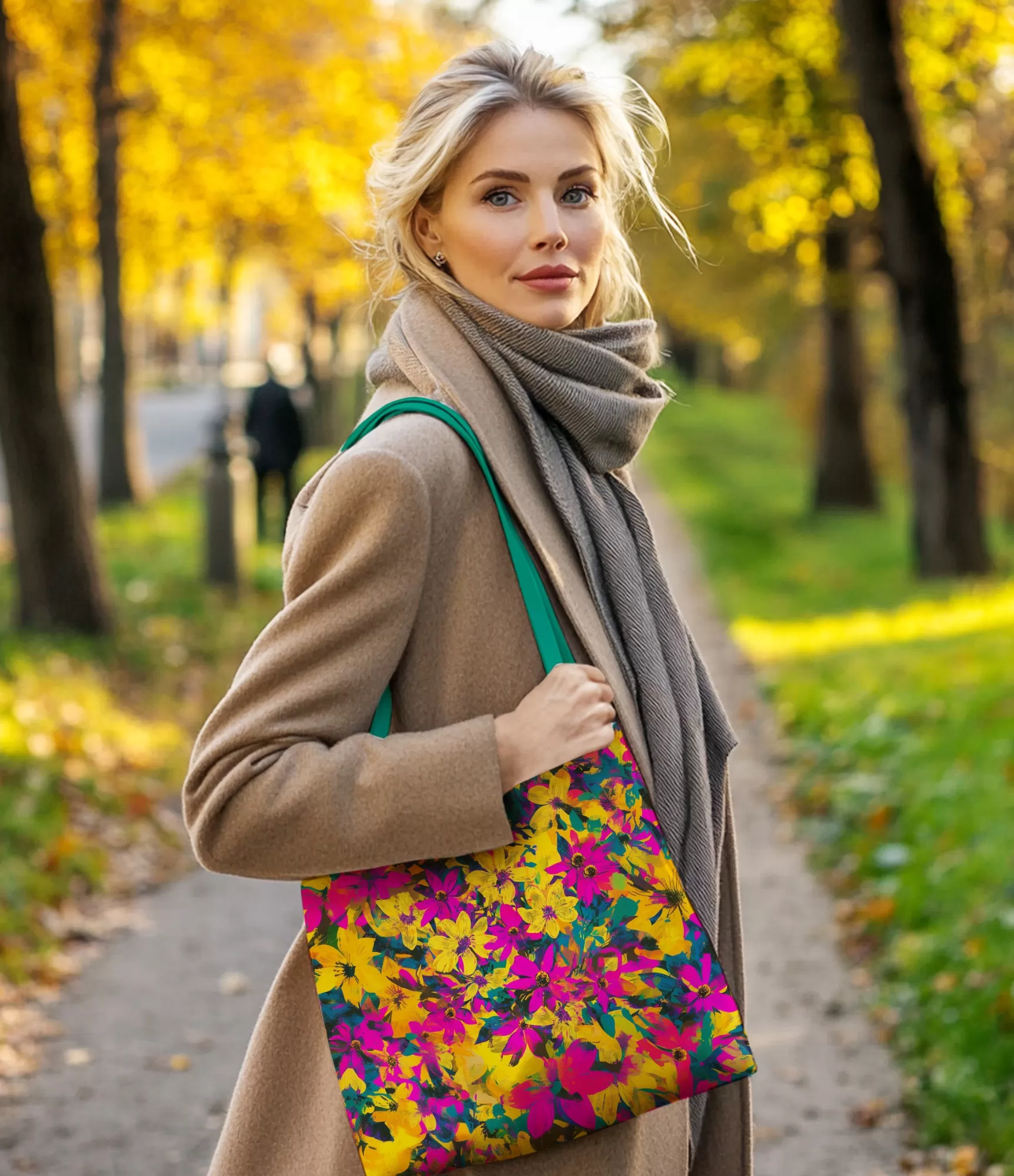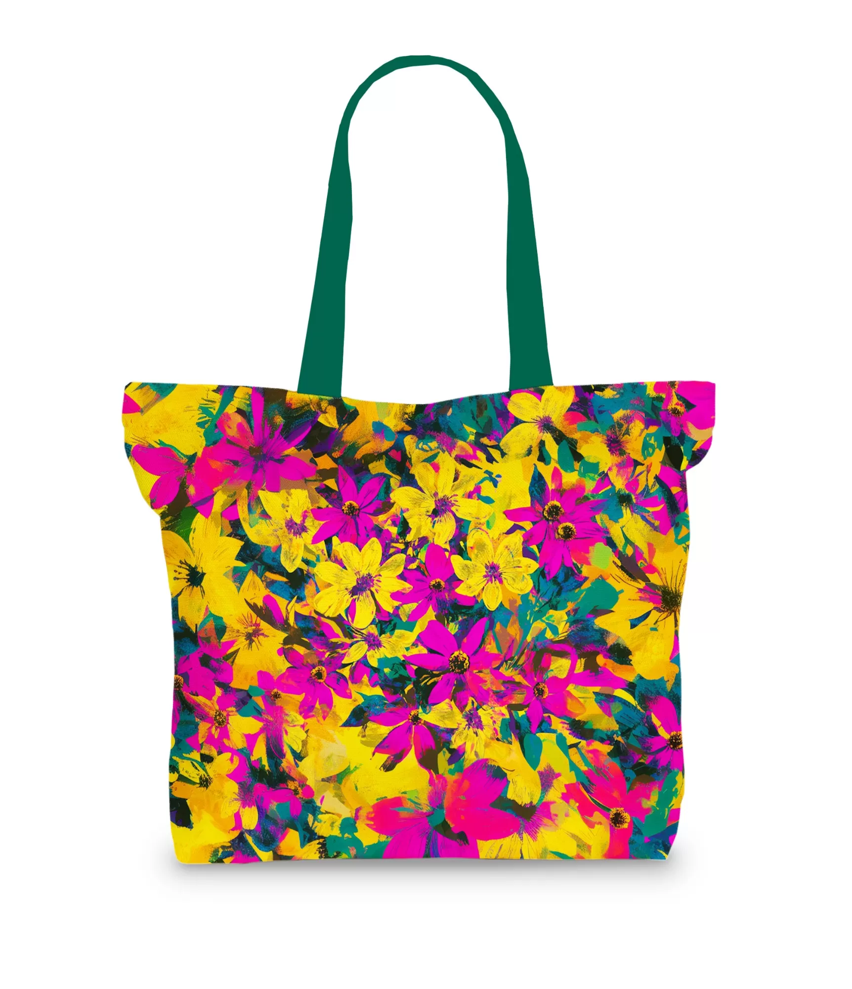 Ця унікальна сумка для покупок прикрашена яскравим квітковим орнаментом, у якому переважають насичені жовті відтінки, доповнені інтенсивними деталями рожевого, зеленого, фіолетового та синього кольорів. Квіти, виконані в дещо абстрактному стилі, ніби випадково розкидані по тканині, що надає сумці живого та привертаючого увагу дизайну.