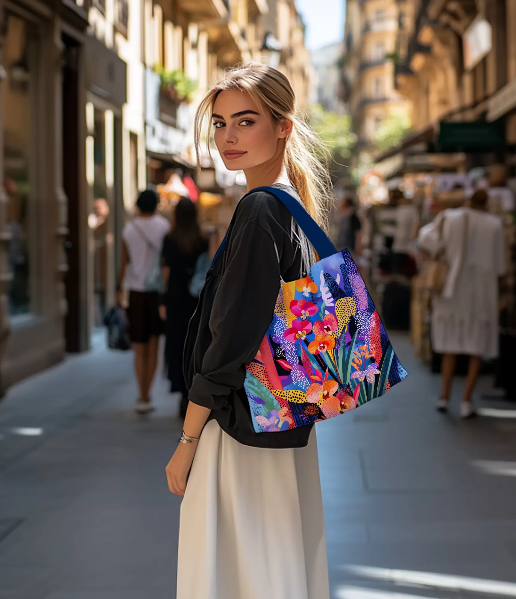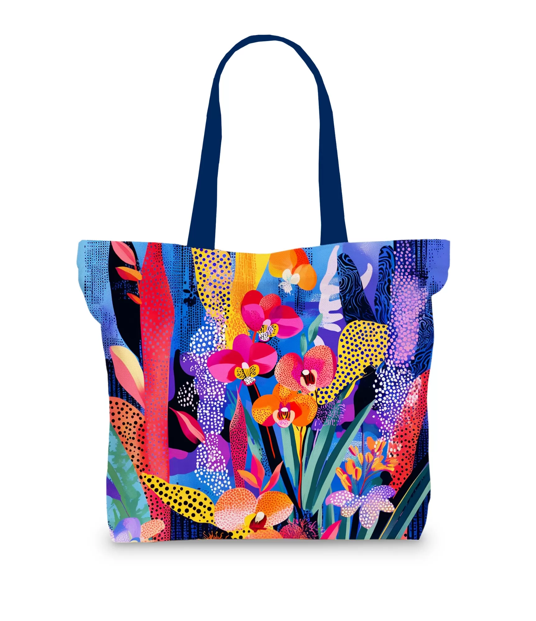 Ця кольорова сумка для покупок — чудовий вибір подарунка для жінки, яка хоче додати грайливості та екзотики до свого повсякденного стилю! Основний акцент — яскравий стилізований квітковий орнамент, який не є точною копією природи, але створює грайливе та майже абстрактне тропічне зображення. Основні елементи орнаменту — орхідеї, зображені яскравими рожевими, оранжевими та жовтими кольорами, разом з різними тропічними листям та рослинами.